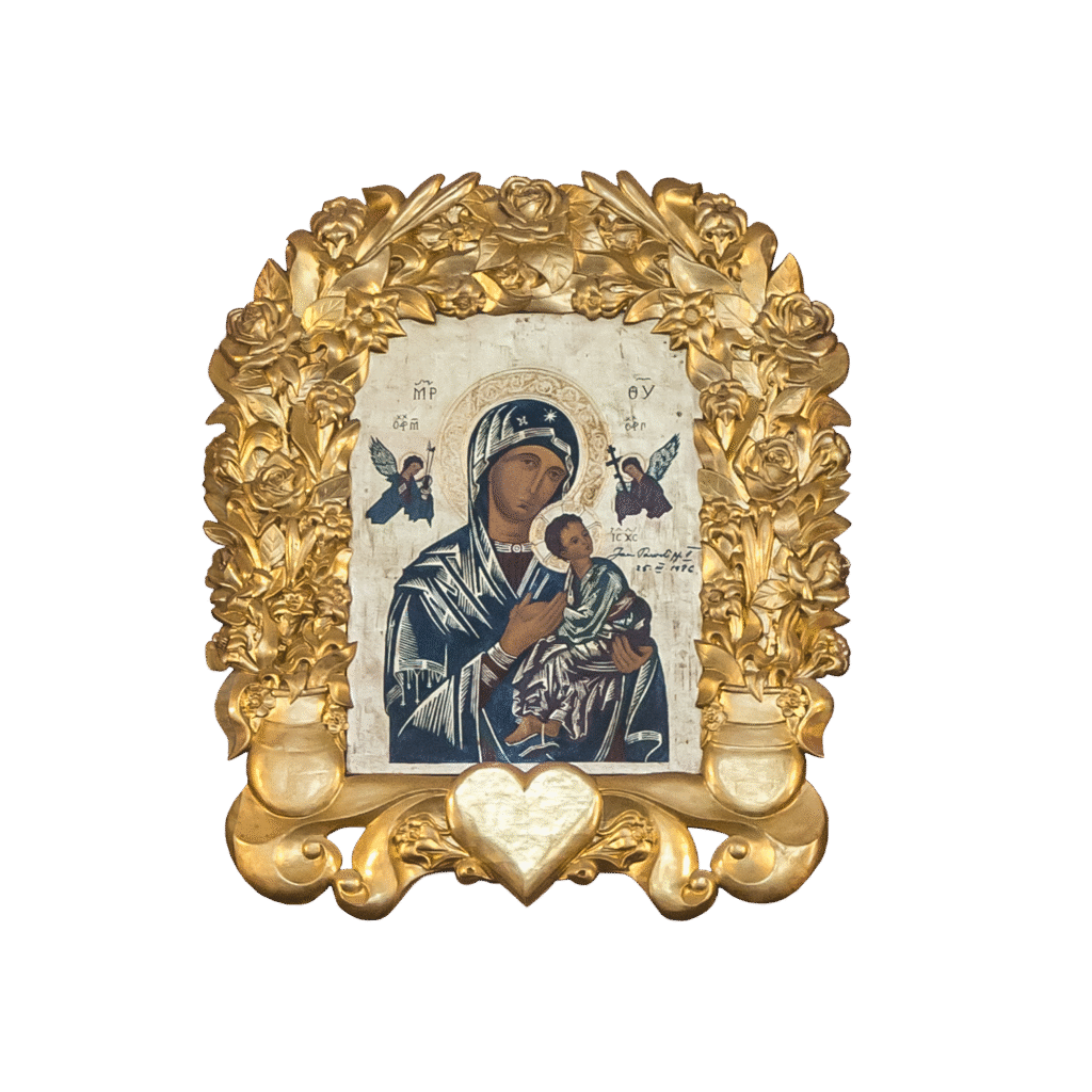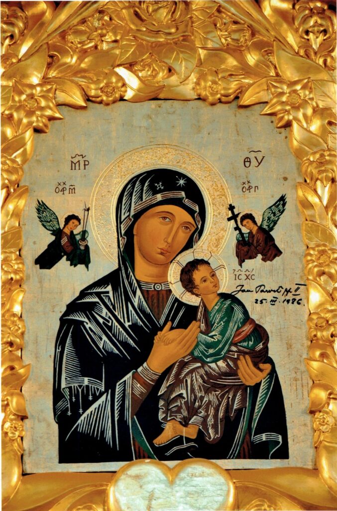 Tytuł Matki Bożej Nieustającej Pomocy jest na trwałe związany z dostojnym wizerunkiem Maryi, czczonym w Rzymie. Obraz namalowany na desce o wymiarach 54×41,5 cm, pochodzenia bizantyńskiego, przypomina niektóre stare ikony ruskie nazywane Strastnaja. Jego autorstwo jest przypisywane jednemu z najbardziej znanych malarzy prawosławnych wczesnego średniowiecza, mnichowi bazyliańskiemu – S. Lazzaro.