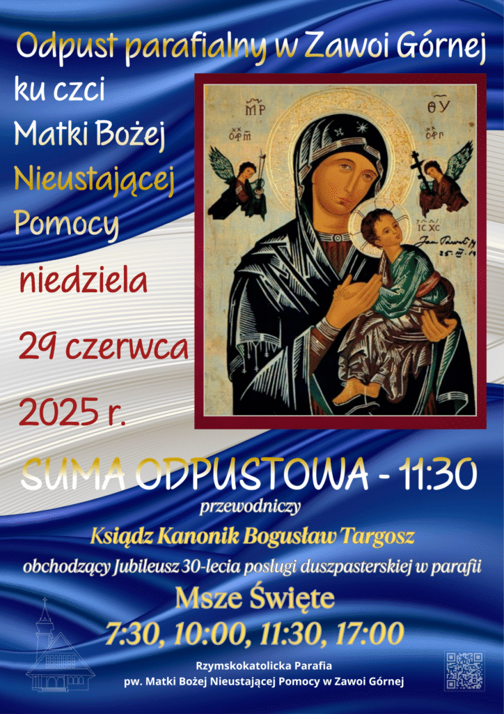 Zapraszamy na odpust z okazji święta Patronki naszej parafii, Matki Bożej Nieustającej Pomocy. Zwyczajowo uroczystości obchodzone były w niedzielę po 27 czerwca (w tym dniu przypada wspomnienie Matki Bożej Nieustającej Pomocy). Zachowujemy ten zwyczaj, dlatego uroczystości odpustowe odbędą się w niedzielę, 29 czerwca. Niech nie zabraknie w tym dniu Parafian, czcicieli Matki Bożej i Gości przebywających na wypoczynku.